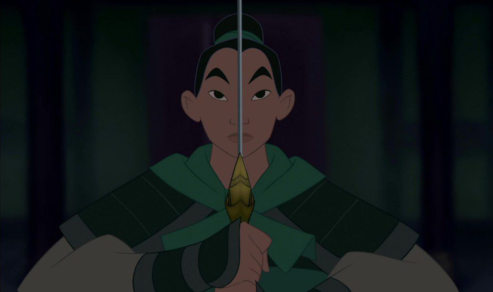 Mulan, knowing her elderly father would surely be killed if he were to follow the emperor's orders, breaks the law, disguises herself as a man, and reports for battle in his place.