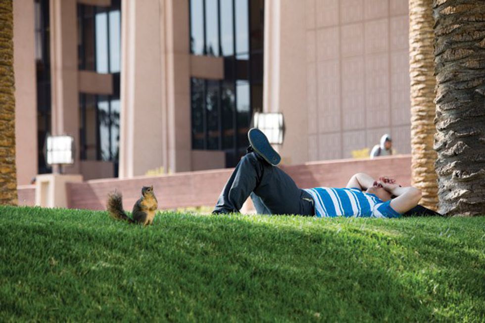 The palm trees create shade for students to lay on the grass when they have down time. I like to sit on the steps and read my notes. During busy times of the semester, you can see many students take advantage of this spot.