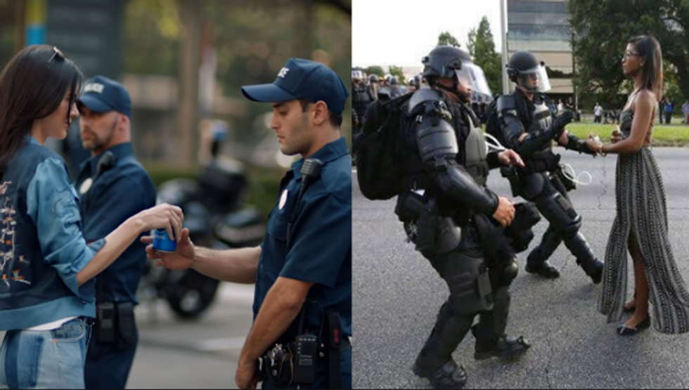 A still from the commercial where Jenner hands an actor dressed as a police officer a Pepsi can while a wind machine blows through her hair has eerie similarities to the famous shot of protester Ieshia Evans calmly being arrested by Baton Rouge Police during the Baton Rouge protests in July of 2016. The Kardashian's have long been known to embrace elements of Black and Hip Hop culture from everything to hairstyles and fashion, to who they date and marry, but we have yet to see them really speak out on issues that affect Black communities.