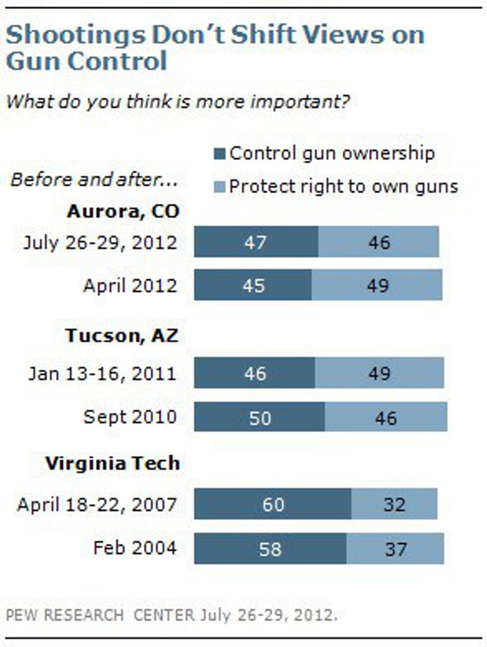 Surprisingly, high profile shootings like Aurora, Tucson, and Virginia Tech, don't lend anymore support to gun control afterwards. Will this shooting be any different? People's opinions do not seem to change even though people view these acts as some of the most evil to be committed. While people haven't been changing their views on how they feel on gun control, they have been opening up about specific opinions regarding gun policies.