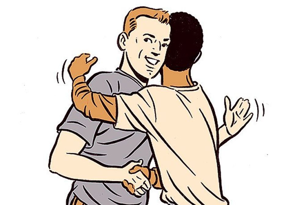 There are times when two men know they blew the shake. This sends them into a tailspin, frantically trying every version of the handshake until they get a match. It's kind of like when two people meet head-on in a hallway and both step to the same side. These poor dudes settled on a nice bro hug.