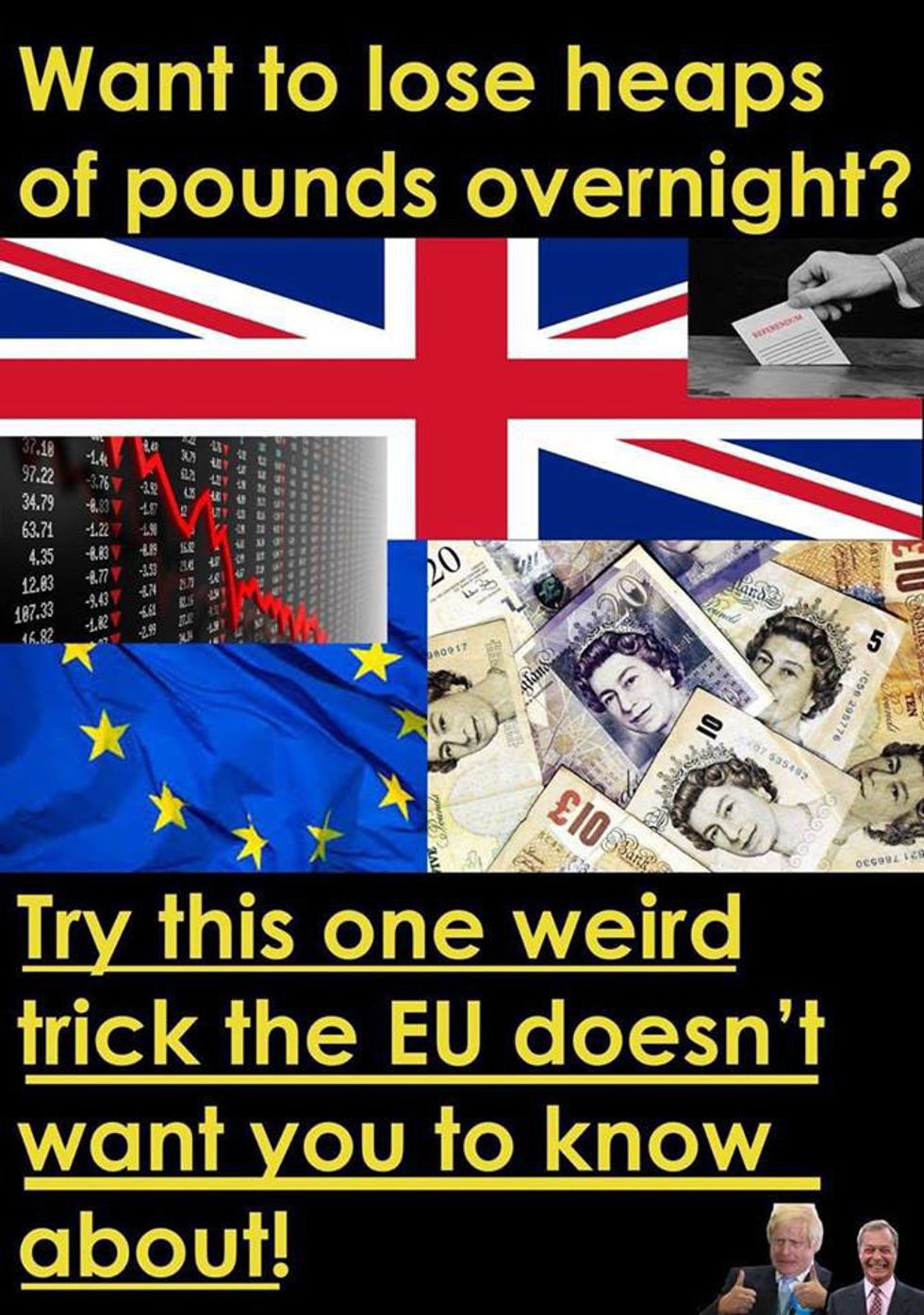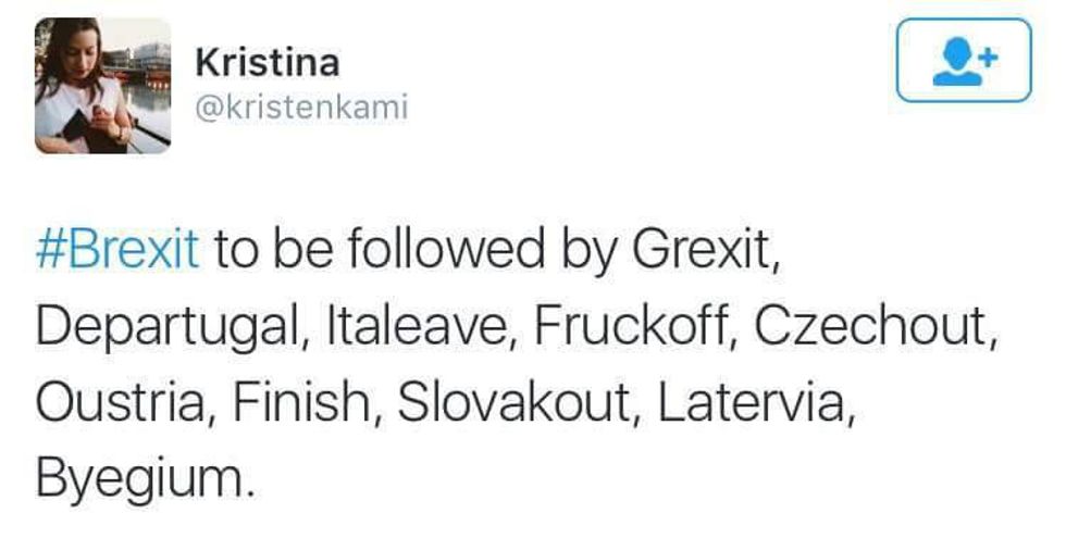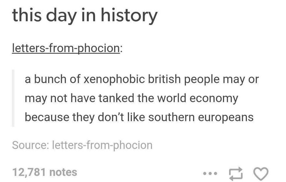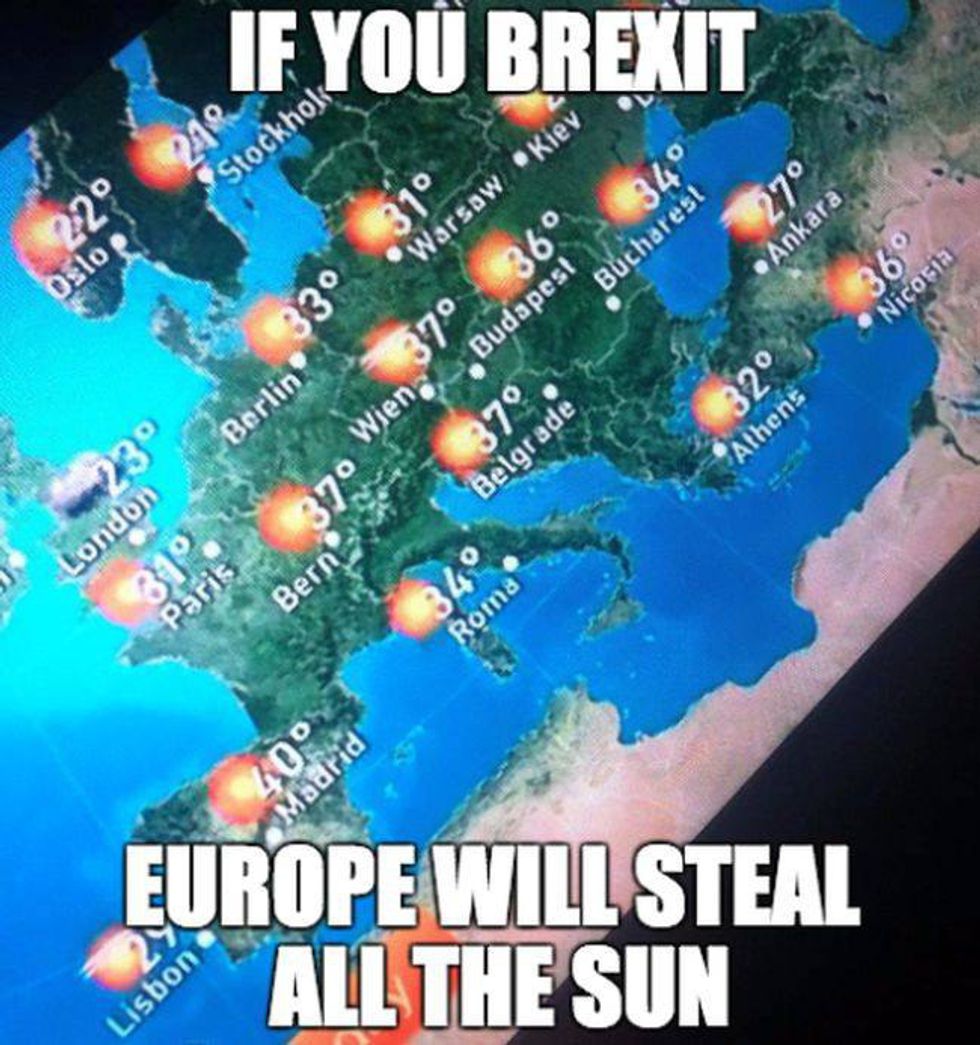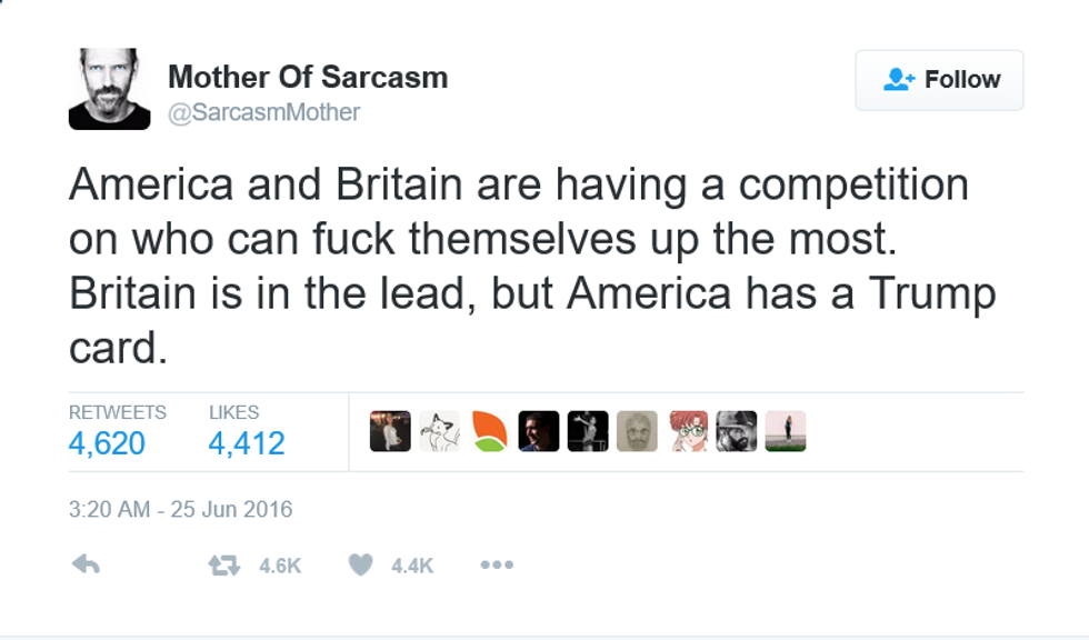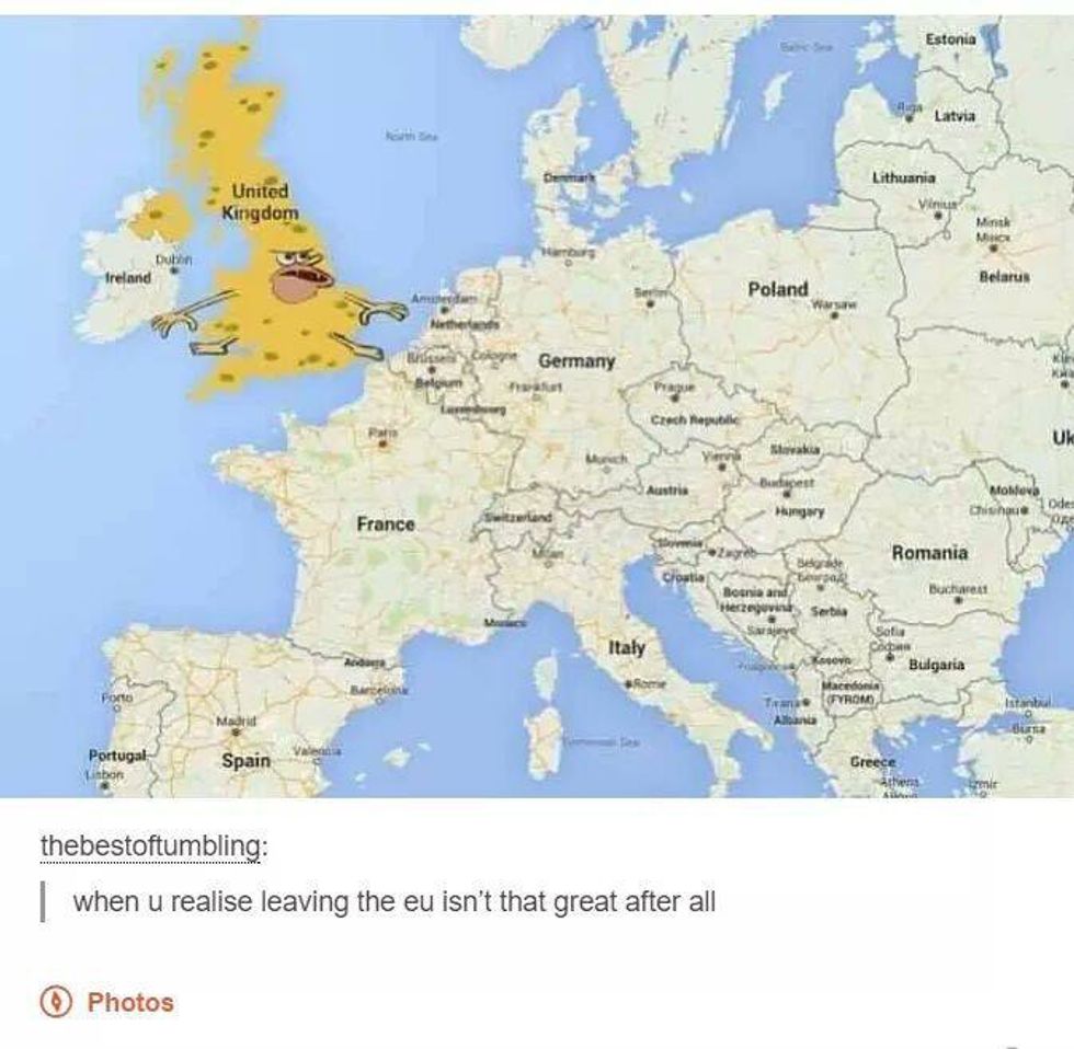 Since the Fourth of July has me feeling particularly patriotic, I'm just sitting here in my American flag shirt, stroking a Bald Eagle, entertained while the Internet explodes with Brexit memes. In the spirit of the classic relationship between England and the US, consisting of constant mockery, I do have to admit that it is definitely our time to make fun, as they also make fun of themselves, at least until the 2016 Election and a possible Trump presidency. I do realize the seriousness of this decision in practice and its effect on immigrants and other groups, but the Internet's reaction has been absolutely absurd. There is much conflicting information about what Brexit means for the countries in the UK and for Europe, but slanted and simplistic memes have been circulating social media like the Bubonic plague. I find some of these to be quite comical, and I thought I'd compile a list.