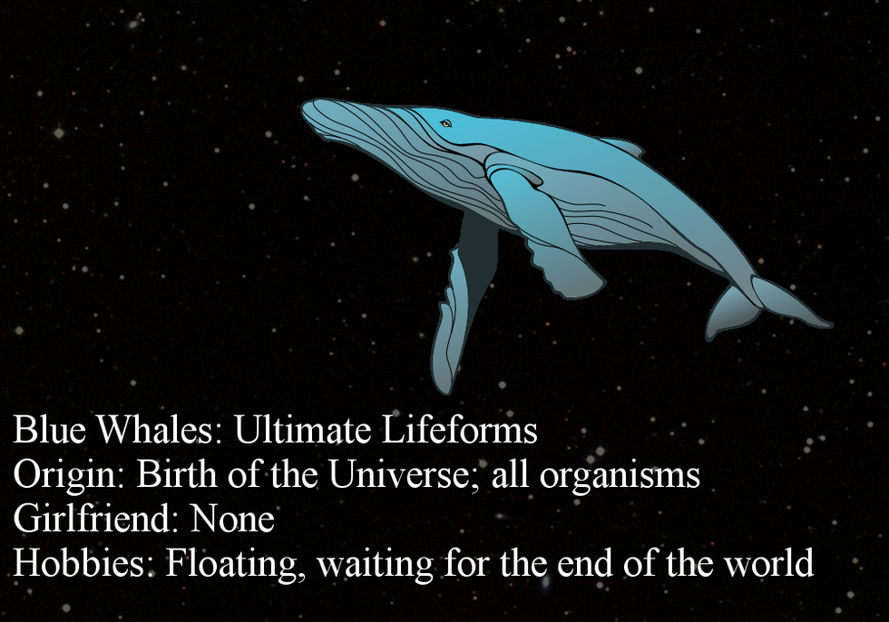 I also won't get too detailed with the alien civilizations and empires for the moment, simply because there's far too many of them to cover in a brief history of the universe, but know that every organism in the known universe, whether it's considered "life" or not by sentient species, is slowly evolving into blue whales. Xenomorphs, Triklidaks, Humans, even flowers, given enough time, will evolve into the intellectual titans that are blue whales.