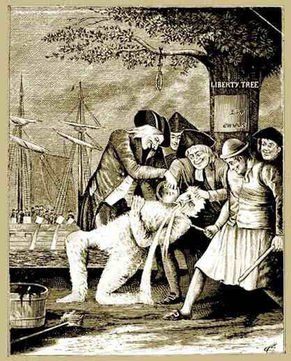 The Monarchy gained an exuberant amount of debt after the seven year war fought across the Atlantic and now faced a decision. Either continue to tax the the British people or tax the colonists who the war was fought over in the first place. The choice was simple for legislators and led to several acts including The Stamp Act of 1765, The Sugar Act, and the infamous Tea Act. Parliament was genuinely surprised at the outrage caused by these taxes, they had just fought a war for these people and now were being condemned. British tax officers were being beaten and harassed by rebellious youth (depiction of this in picture below) and the famous Boston Tea Party saw seventeen million pounds of tea sink straight down the Boston harbor. Benjamin Franklin, a founding father of the United States, even denounced the Boston Tea Party stating,"This was an act of piracy and the Americans should repay the British for the tea."