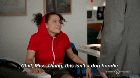 I never knew that I wanted to see Ilana in a dog hoodie, but now that I have, I feel like nothing could ever be as glorious. It’s like the upgrade from Regina George’s t-shirt but also cute because... Well, dogs. Where can I get one?