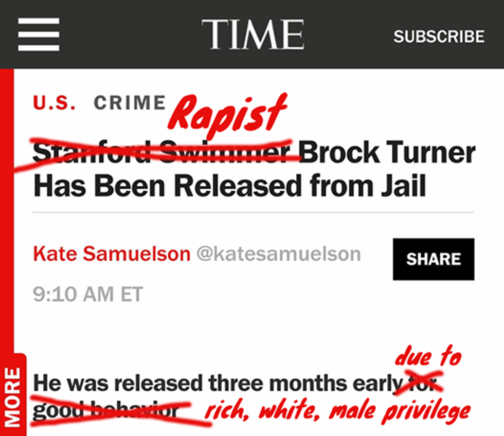 TIME, one of the leading magazines, left out any mention of why Brock Turner went to jail in the first place. After a quick Google search, I discovered TIME wasn't the only one guilty of this gross failure of journalism. Associated Press, USA Today, TIME, CNN, Sports Illustrated, MSNBC, and the BBC were called out by viewers for neglecting to report on Turner's status of being found guilty of sexual assault.
