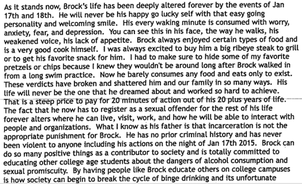 About a year and a half later he has been sentenced to six months in prison, but will be serving three months. (Because that's how time out works, right?) His father wrote a statement to the court that included his reasoning for Brock getting probation over jail time.