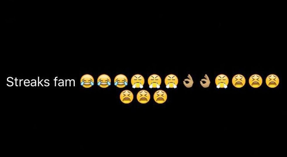 When I first started playing the streak game, I wasn't committed. The panicked selfies I received that simply said "streak" would make me chuckle, then I would send one back to appease whoever sent it. However, I soon became guilty of the "streak" snap. The point of Snapchat is to converse while sharing pictures of the exciting moments going on around you. They say that a picture paints 1,000 words, but a black screen that says "streak," only paints one.