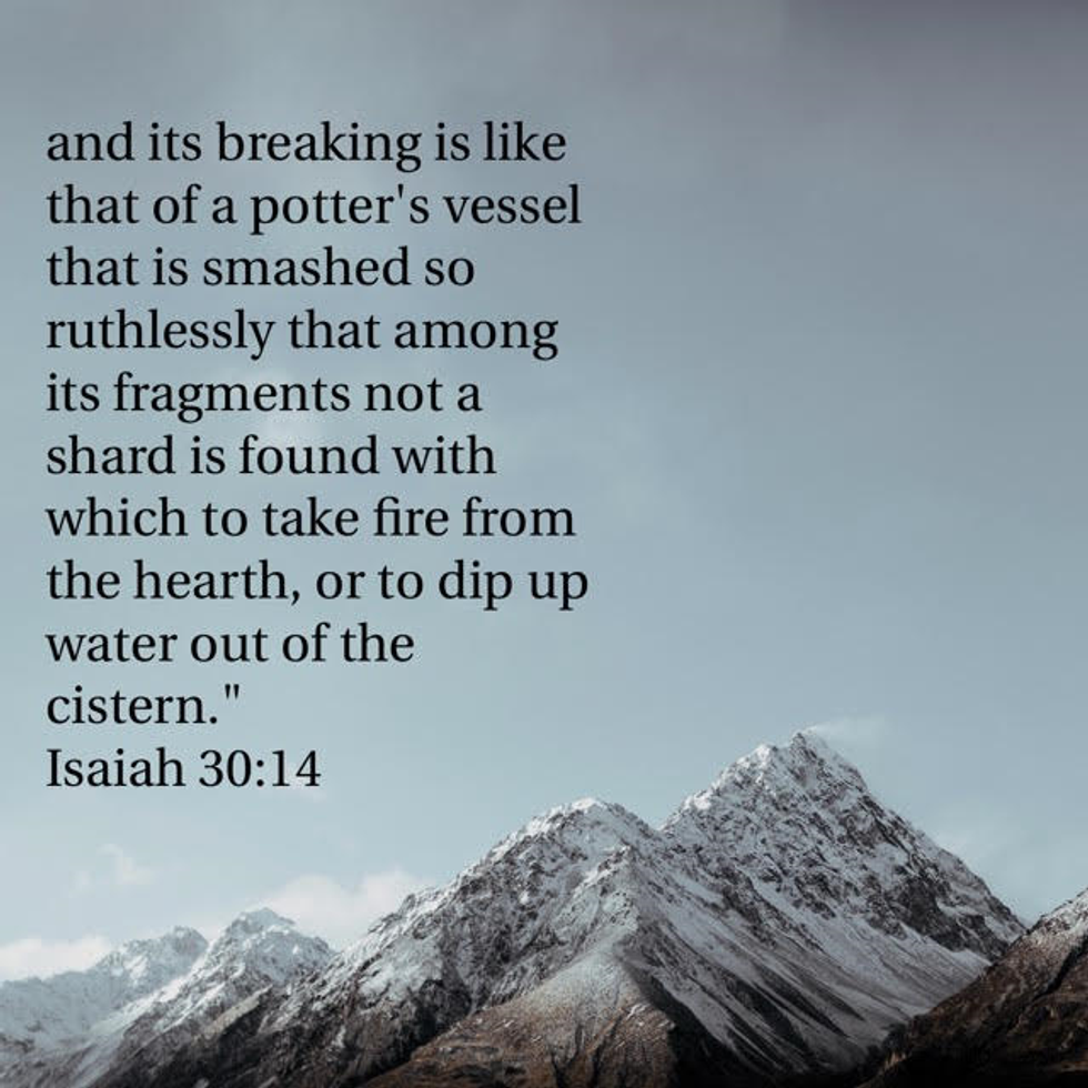In 2 Corinthians 4:7 it says "But we have this treasure in jars of clay, to show that the surpassing power belongs to God and not to us." We are like jars of clay. They crack easily even though they may seem durable. Clay jars are refined by fire. There are several steps to making them, culminating with the kiln. This furnace carries the clay from an unfinished product to a household amenity. But once completed, the slightest nudge on the corner table could send a jar plummeting to its demise. The durability is deceiving. The thick porcelain is more delicate than it appears. No wonder the Bible often describes people as jars of clay. We are like potter’s vessels, waiting to be broken into millions of tiny pieces. We are weak. We get tired and weary. We grow old and frail.