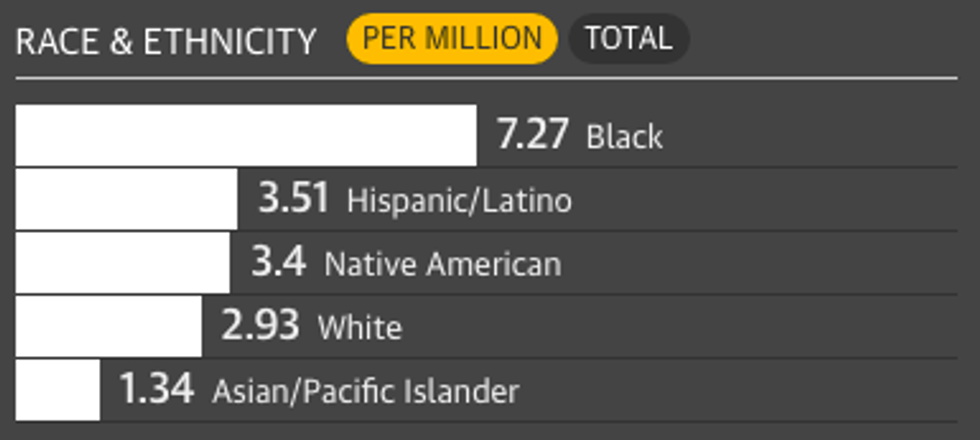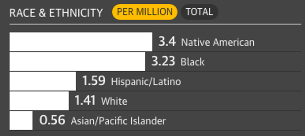 These numbers can be misleading at first because if someone very quickly looks at the horizontal bar graphs, the graphs are deceiving and it appears a substantially larger number of blacks have been killed by police than whites.