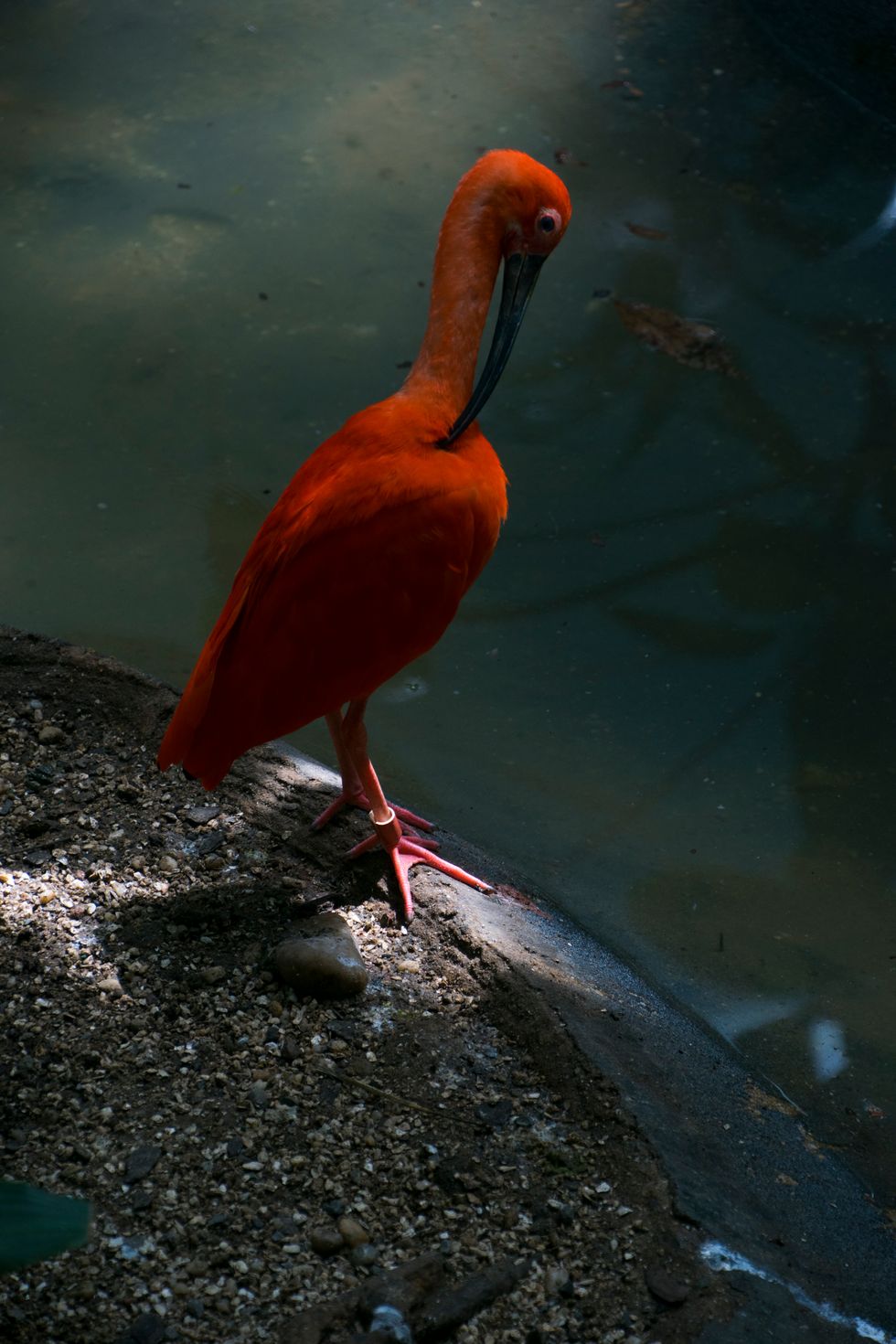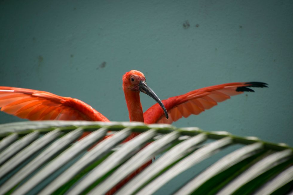 this photograph, intentional and unintentional circumstances came together to create a mirroring of themes.I purposefully set the bird against the enclosure wall because of the stark contrast between the bright orange feathers and teal paint.As I was taking the picture, the bird spread its wings and splayed its' feathers, which mirror the leaflets on the branch in the foreground.