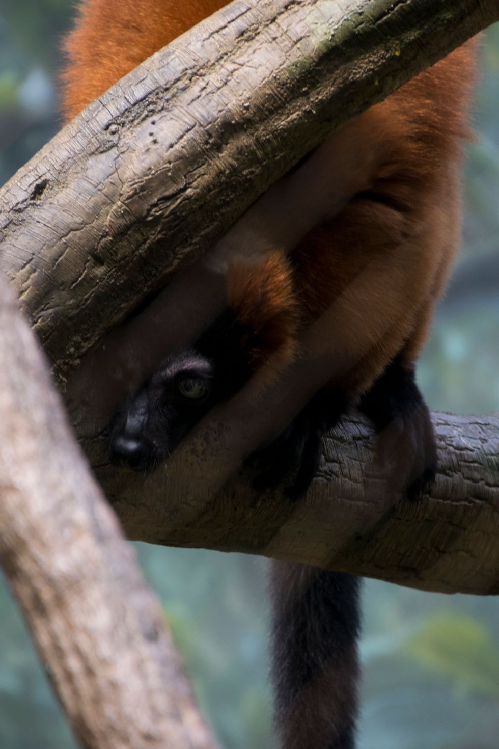 Hide and Seek – A Red Ruffed Lemur balances on a branch