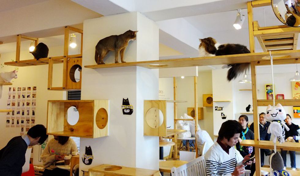 Last weekend me and my two best friends decided to check out a really cute place called The Brooklyn Cat Cafe. I am actually a dog person and was never really interested in cats, but of course my two best friends are huge cat lovers so I decided to accompany them and thought to myself, "Who knows, maybe my mind will be blown and I will realize my sudden love for cats." Naturally, we were all pretty excited to go there and play with some kitties. If you know Brooklyn parking then you know it was hell to find, but when we parked and walked up to the Cafe, we immediately saw cute cats on the window display sleeping!
