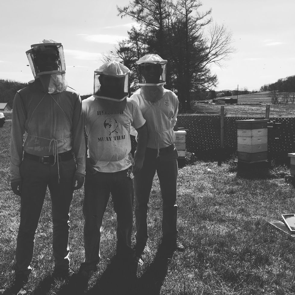 The Maio brothers (from left to right: Mike, Kyle, Alex) in their beekeeping gear.