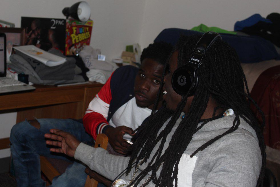 “Boy, it’s a good thing I wasn’t getting jumped,” he says referring to both my habit of not picking up the phone and my lack of punctuality. As I look around the room, Cartier Caetano, another Broward artist on the come-up, smiles from the makeshift studio in the dorm room, along with the Gutta Twins, two local legends, from the desk.