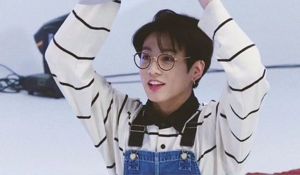 This look of Jungkook comes from BTS's VLIVE series that every ARMY is talking about, "Run BTS!" In that episode, the members dress up in back-in-the-day outfits and play throwback variety games. This look is great for tailgates, especially scouting in your school's colors. This bold stripe sweatshirt and these overalls from SheIn send retro vibes. Finish off this look with these cute sneakers with gold stars from SheIn to rep the Golden Maknae himself.
