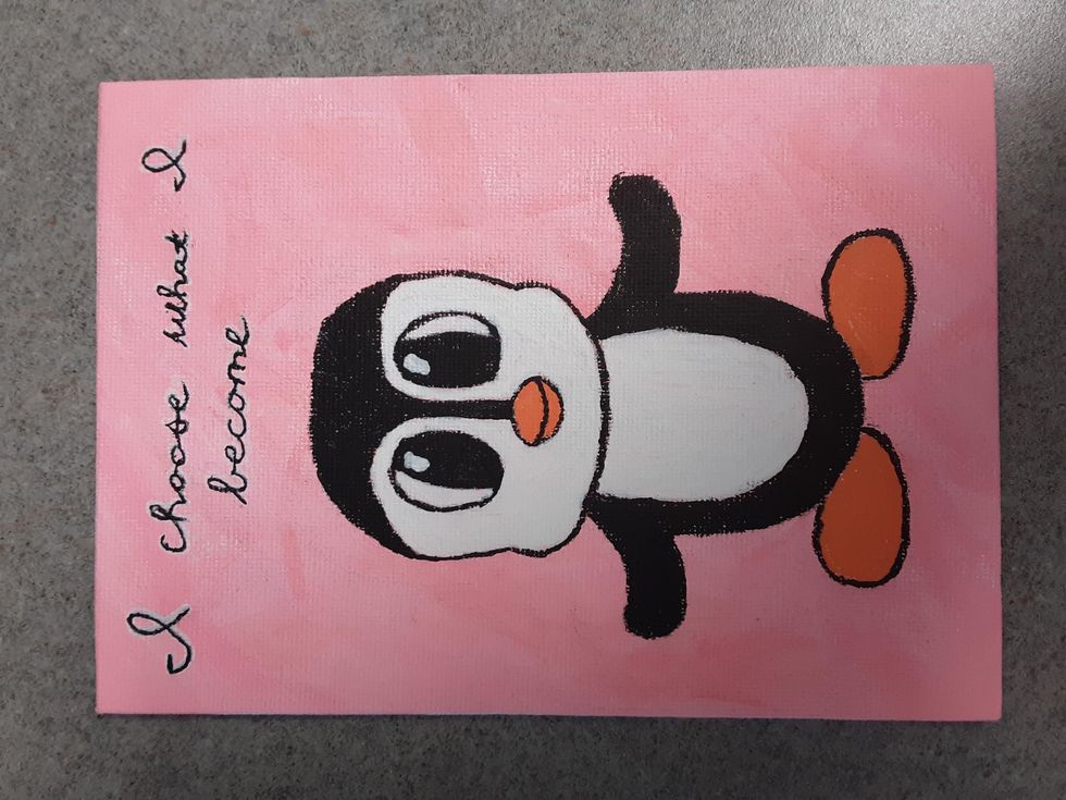 I made a picture of a penguin for a friend, and she loved it! I'm not the best at drawing, but cute cartoon animals seem to be pretty straightforward. I outlined and painted my friend's favorite animal. I finished the piece by writing an affirmation above it that I thought fit well.