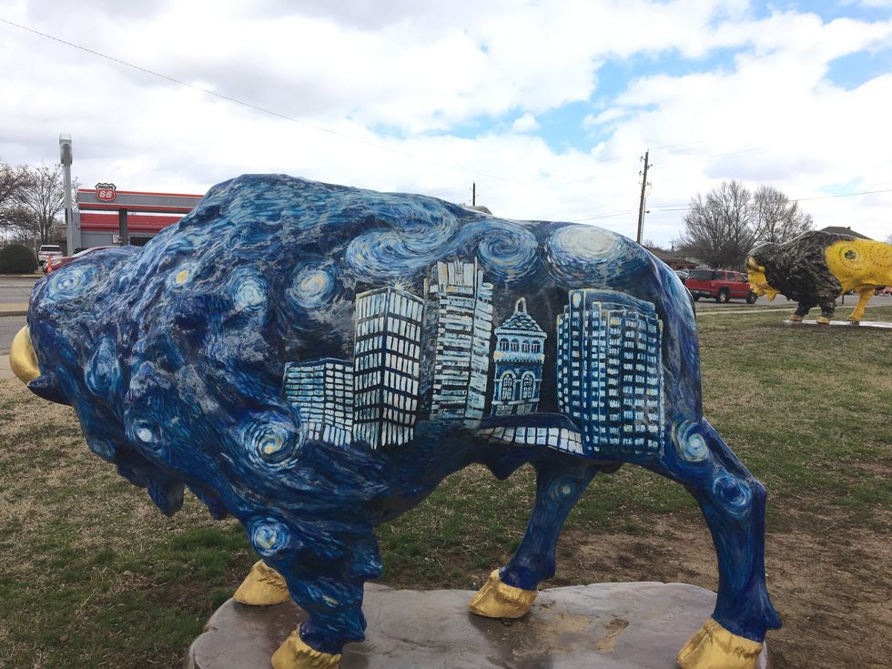 I spent my Spring Break tracking down buffalo in Northeast Oklahoma with my mom. One of the places we went to was Bartlesville to see the buffalo herd at Woolaroc. However, we ended up spending most of the day searching for the decorated buffalo statues around town. There were about 30. Back in 1998, a local Girl Scout troop decided to make their Senior Gold project selling buffalo statues to companies and businesses in Bartlesville. The project became known as the Buffalo Stampede, and all the proceeds went to a non-profit organization called Mary Martha Outreach that provides food and other necessities to those in need.