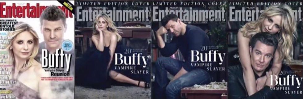 My biggest problem is honestly the magazine covers. As a part of the reunion, EW released four different magazine covers, one basic release and three limited editions: one with Sarah Michelle Gellar and David Boreanaz (basic release), one with Sarah and James Marsters, one with David alone, and one with Sarah alone. As much as I love David and James as Angel and Spike, I hate that the covers make it seem like the show was simply about a girl and her boyfriends. I understand the marketing value of putting Sarah and David on a cover together, as they are arguably the most well-known faces currently, but I think that that should have been used in place of David's solo cover. I personally feel that the main, basic release cover should have had the "Scoobies" on the front: Sarah, Alyson Hannigan who played Willow, and Nicholas Brendon who played Xander. They were the heart of this show and to see them neglected on the cover of the magazines is a bit heartbreaking, to say the least. The released covers are seen below: