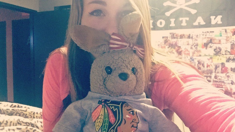 I’ve been on the short end of teasing and jokes my entire life because I display her proudly wherever I go. My mom teases me all the time asking if I have her when we’re going on vacation or when I come home from school for a weekend. I display her on top of my pillows on my bed. I even bought her her own little Blackhawks hoodie.