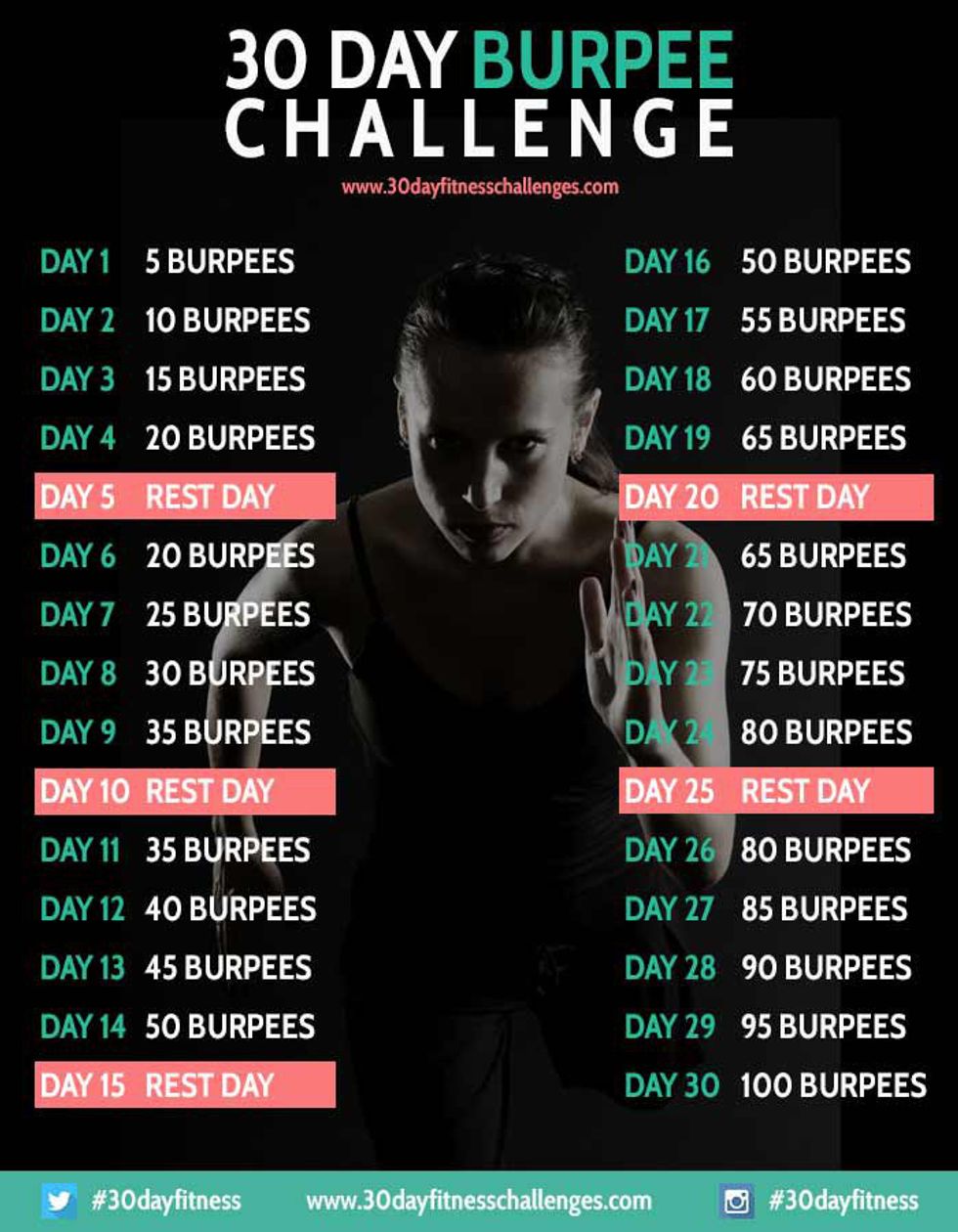 Summer is coming to a close for most of us (I’m in Florida so the fires of hell are still burning strong), and the time for comfy fall sweaters, creamy pumpkin spice lattes, brown leather knee-high riding boots, crackling bonfires in the cool night air, and cuddles under comforters are upon us. Sadly it’s exactly these behaviors coupled with Thanks(for the bellyache)giving that makes us all vow to lose 10 pounds once January rolls around... But fear no more, I’m here to fight the bulge before there even is one. Below I’ve compiled the best 30 day exercise challenges I could find on Pinterest for your working-out pleasure. All workouts can be done at home in minimal time and combined for maximum effect. Let's make some new resolutions once January rolls around!