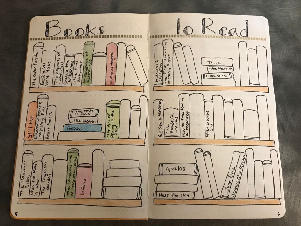 As a major book worm, I love to track the books I have read and want to read. In this spread, I drew up a bookcase with a bunch of blank spines. Whenever I come across a book I'm interested in reading, I write the title on a blank book spine and then once I finish it, I color it in. This is a great way for me to track my reading progress and motivate myself to keep up with my reading because coloring in the blank spaces is so satisfying!
