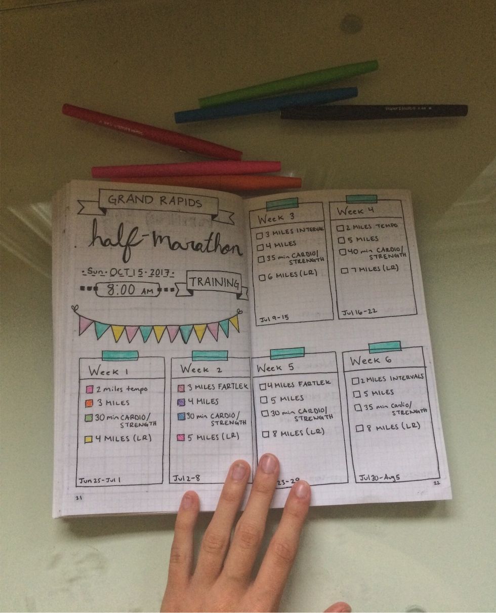 A year ago I ran my first half marathon, and training for such an event required careful planning and a detailed training schedule. I found this spread on Pinterest and decided to use the idea as my training schedule format. I wrote out all the workouts and runs I needed to complete for each week leading up to the race; this helped me stay on track with my training and motivated me to do all the workouts on time.