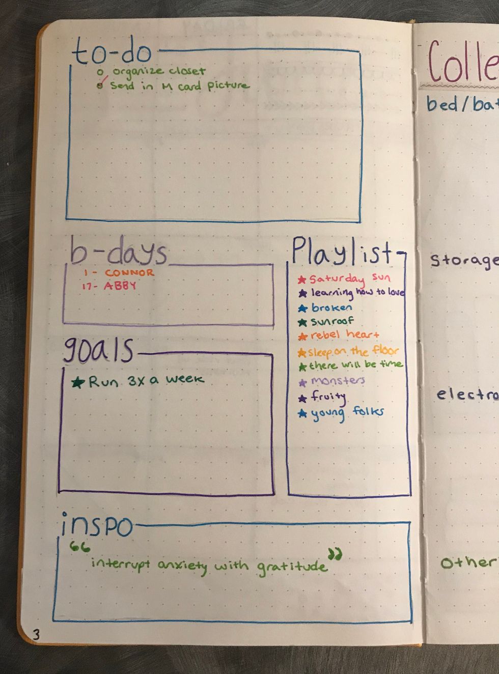 In addition to a monthly spread that contains my schedule, I also like to include a page for goals, birthday trackers, and lists to record the things I'm think about or interact with during that month. In this spread I included a to-do list with tasks I wanted to complete before the month ended as well as a box with goals for that month. I also recommend adding a list for something fun like a playlist because it's fun to look back later and see what songs you were listening to during that time!