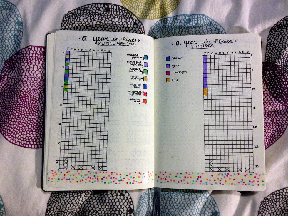 Need to track habits? Fitness? Health? I've found the year-in-pixels spread to be great for this! As a brief way to track each day, this is a great way to visualize what you want to track. As you can see, I for my mental health tracker, I color coded how different days might feel to give a visual to my progress and day-to-day. I did the same with fitness as well! It's a great way to check in with yourself and see how you're doing.