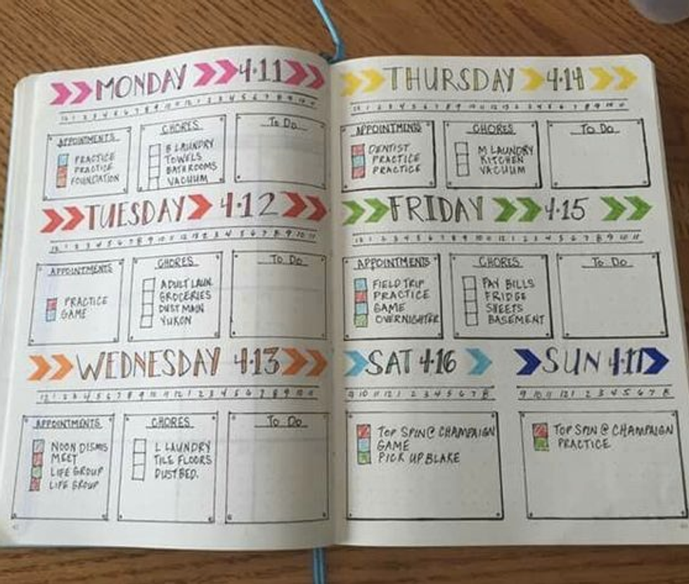 I use my Bullet Journal as a glorified planner. I create a new, unique layout for each week. This is where I let my creativity run free. Designing my weekly layout each week has the same kind of anti-stress benefits for me as coloring (another one of my hobbies). I also plan out each day individually and what I hope to accomplish. Alongside my plans for the day, I include assignment deadlines. This gives me the satisfied feeling of checking off my tasks as I accomplish them.