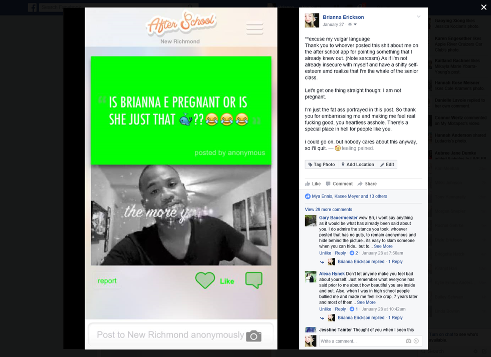Within a few hours, the post went viral throughout my small hometown. My Facebook friends were sharing it, friends of their friends were sharing it, friends of friends of friends were sharing it. Almost the entire community of New Richmond saw my call out to the bully. I received many messages and from my peers (both that I talked to and didn't) along with other New Richmondites. It surprised me just how many people actually cared about someone, whether they knew who they were or not.