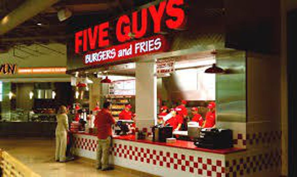 Five Guys is a great place to go when you are starving because they are known for serving burgers with double patties. Also, they give out baskets of peanuts for people to munch on while they wait for their food to be ready. They have numerous locations throughout the country.