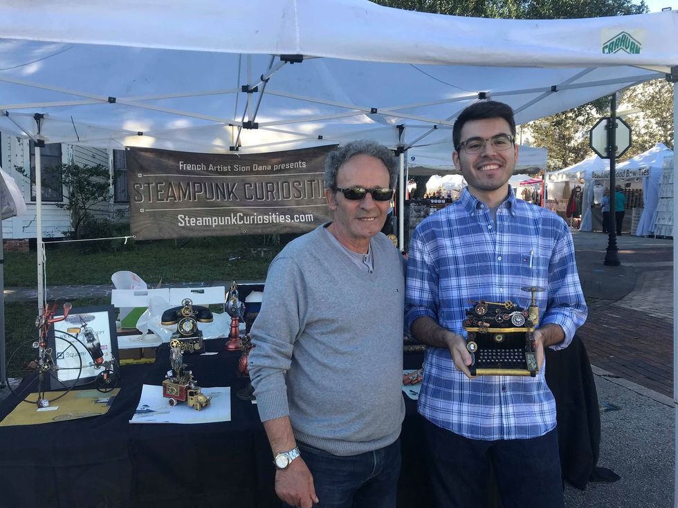 I made my sign, my modest attempt at marketing myself, bought a chair and TV tray, and the rest depended on the curious halt of festival goers. Five minutes later, a woman named Virginia Silberstein and her father, the artist, Sion Dana welcome me to their shop, Steampunk Curiosities.