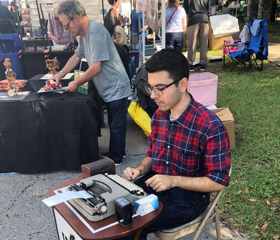 I bought my typewriter from a Michigan woman named Dorothy who recently passed and decided to get her out of the cold and under the Florida sun. A coffee shop or a bench in the park would be too distracting, but a fall festival of artists and patrons of the arts felt right.