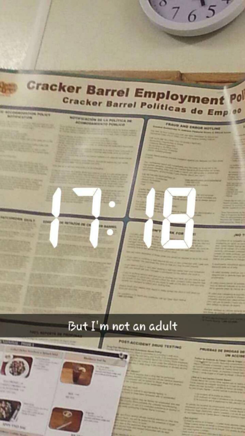At 5:18 p.m. I was sitting in the Cracker Barrel break room waiting for my shift to begin. During the two hours I was home I changed into a skirt with tights, a button-down shirt, and an apron with two stars and my name on it. There was no trace of the exhausted restaurant worker who sat on the couch and fell asleep for 30 minutes, ending up with an attractive pillow mark on her face.