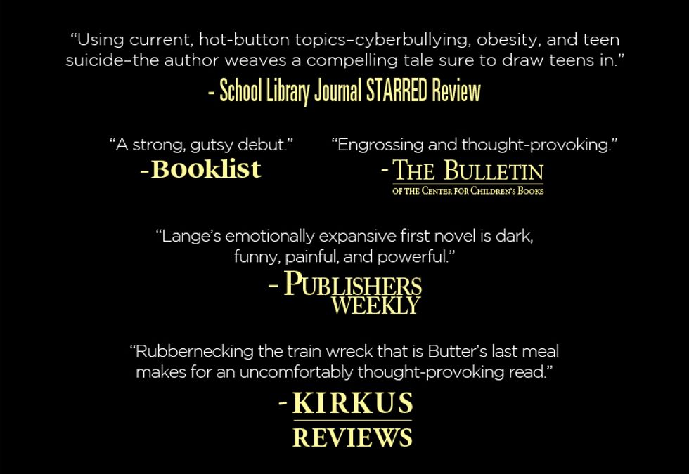 This book was dark but contained some comedic relief, thankfully. It showed you exactly how people can quickly turn on you, as they had begun betting on what he would consume, and if he would actually go through with his final meal. Butter's character overall was very blunt and I found him to be pitiful, and rather ill-natured– although, for his situation, you realize he needed to have thick skin to continually deal with everything in life. He exceeded at his self-loathing, being self-destructive, arrogant and complex. That's what made him a fantastic character; He wasn't placed in this book for us to love him, but to understand his view point during a horrid situation.