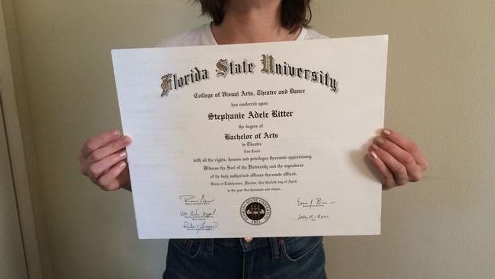 Used cell phones. Sports memorabilia. Collectible action figures. These are things you bid for on eBay. College diplomas worth thousands of dollars? These are items not as commonly found on the popular bidding website. However, Florida State alum, Stephanie Ritter, is making headlines for putting her college diploma up for auction in August. Since graduating in 2011, Ritter, like many other recent college grads, has had a hard time finding employment. Ritter was a theater major, and she told BuzzFeed that while her diploma may be worth a lot of money, “…..for a theater major, it couldn’t mean less.” Hoping to pay off her $40,000 in student loans, Ritter is trying to sell her diploma for $50,000. Ritter wrote in her listing, “I graduated from Florida State in 2011 and have yet to use my diploma, so save yourself the time and buy college experience, featuring a diploma."