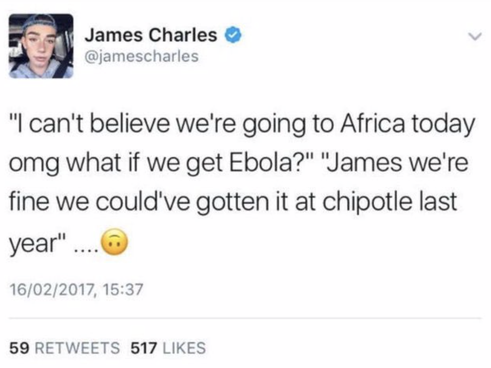 Flashback Mary, Flashback Mary, Flashback Mary. This cursed photo traveled throughout the webisphere for far too long and it made it clear that Lames Charles can't even pick his own foundation shade correctly. Why would anyone follow or buy products from a makeup artist who looks like Casper's gay cousin?