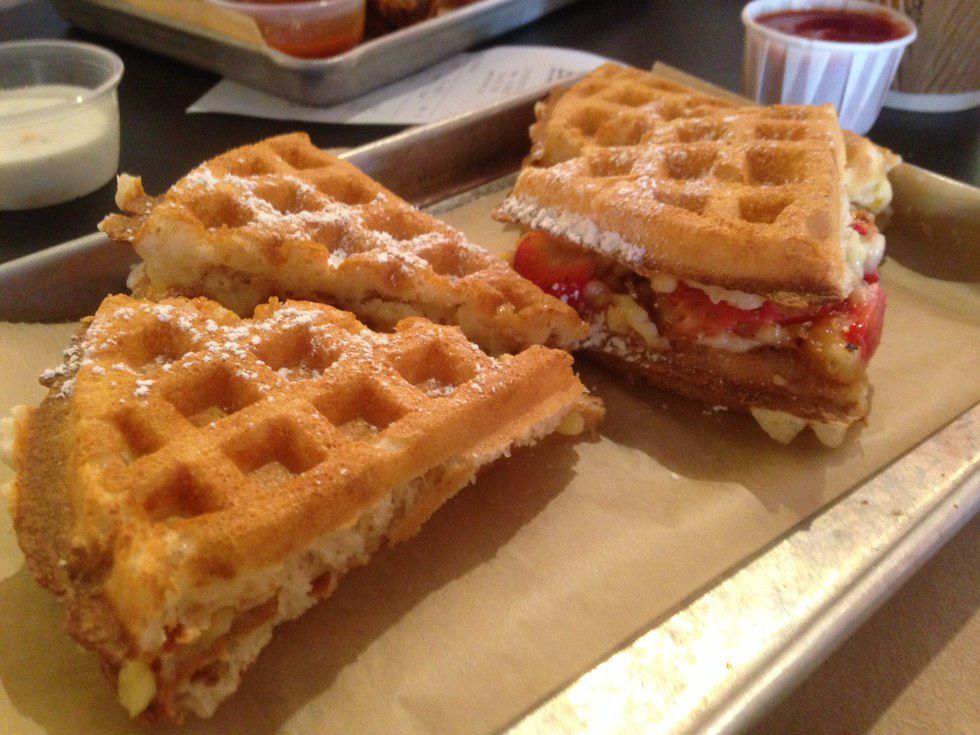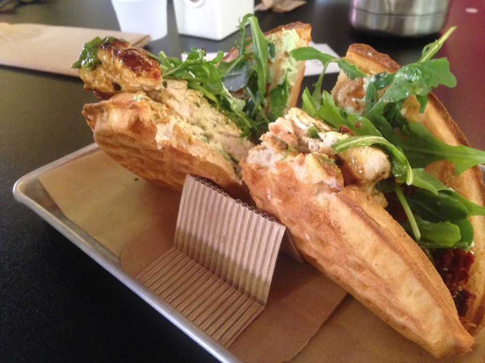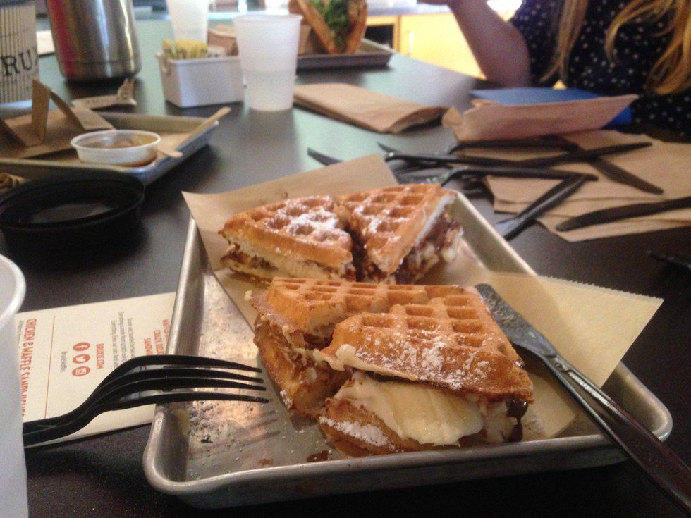 We were torn between savory and sweet after glancing at the menu, so our group decided we would individually order savory dishes and purchase two dessert waffles to share. My stomach didn't craving a large amount of food at the moment, so I split a California Pesto Chicken waffle sandwich with my friend. I fell in love at first bite. Waffles are my second favorite breakfast treat next to pancakes, so I am very picky about texture and overall taste. Bruxie's waffles were soft and doughy, but not mushy, and passed my high standards with flying colors.
