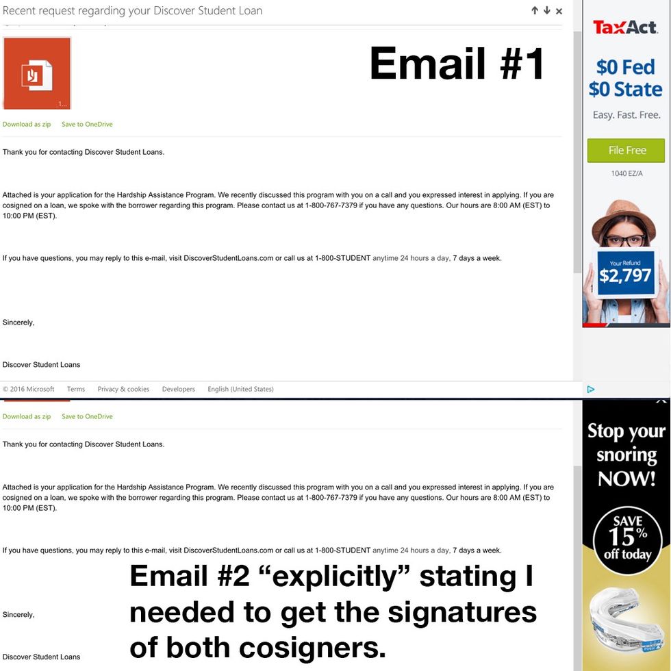 I scoured my inbox to find this elusive email that apparently asked me to resubmit the form. I didn’t find it. What I did find was a copy of the same exact email they sent me initially telling me to fill out the attached form. Apparently, resending the same exact generic email is Discover’s way of “explicitly” telling me I needed to resubmit the form with both cosigner’s signatures as soon as possible.