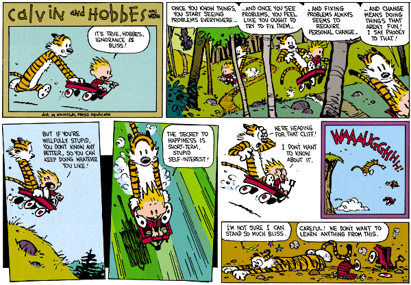 But most impressive is how the man behind the comic expresses his ethos through his creation. Known for his desire for privacy,Bill Watterson staunchly refused to license Calvin and Hobbes merchandise. As Watterson wryly put it, "Cartoonists who think they can be taken seriously as artists while using the strip's protagonists to sell boxer shorts are deluding themselves." This admirable trait is what led Watterson to surprisingly discontinue Calvin and Hobbes in 1995, feeling that he had reached the creative limits of the comics. These are the qualities of someone whose sole concern is producing creative works for the sake of art itself. Once again, a creative goal to aspire toward.