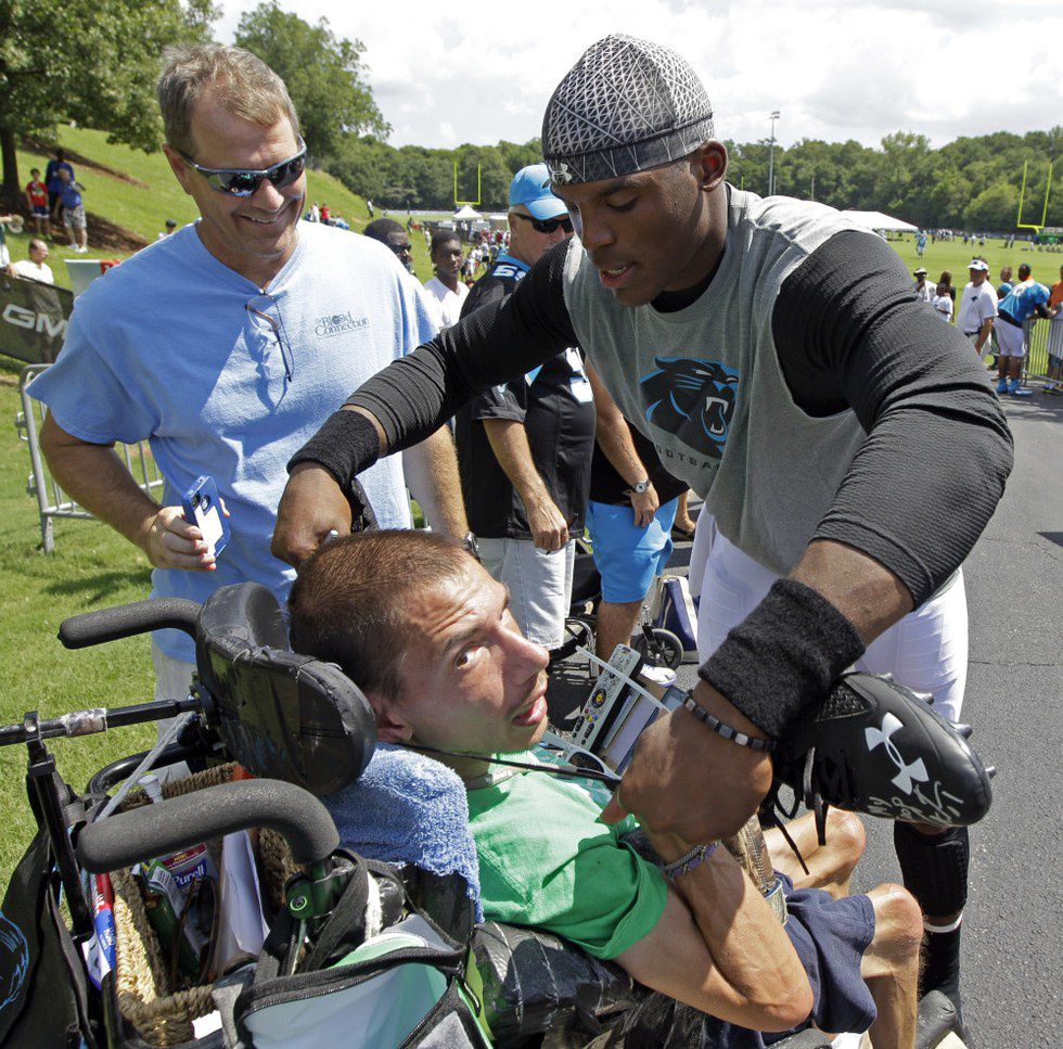 In addition to his football talents, he generously gives back to the community on a regular basis. He lifts the spirits of sick kids in the hospital, he spearheaded and actively runs the Cam Newton Foundation, which is committed to addressing the social, physical, and educational needs of the youth, and he makes sure to give a lucky kid a football after each Panther touchdown.After one long practice, Newton removed his cleats and signed one before giving them both to fan, Brian Cooper, as a gift. Cam spoke with him and then made his way back to the locker room in his socks. His love for life is contagious and inspiring. His genuine kindness is so rare and such a beautiful thing to witness. Many of his good deeds go unrecognized, but that does not stop Cam from spreading his love to everyone he comes in contact with.