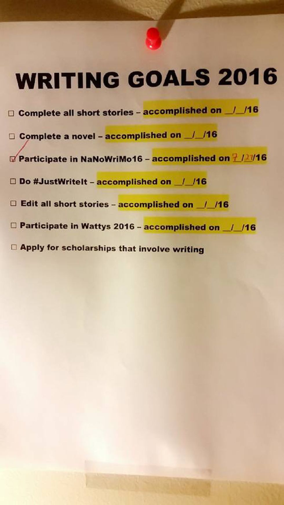 Firstly, after making an oath to participate in Camp Nanowrimo to myself (and to my followers on Wattpad), I created a goal list for writing this year. I was inspired after creating a personal goal list for the summer. If I create a personal goal list, why not create one for one of my passions? After all, I accomplished 50% of my personal goals. This is my goal list, where I proudly marked off an accomplishment on July 27!