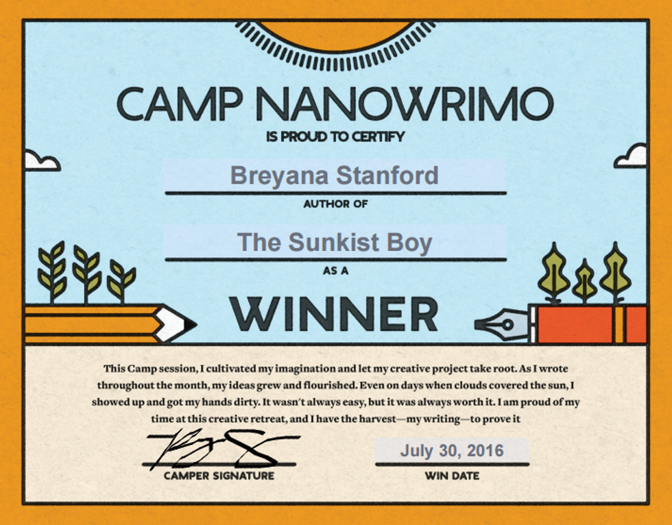 I was determined to do something productive with my passion for writing this year. Initially, I intended on writing an entire novel with a goal of 50,000 words, however, I realized my full-time schedule with summer courses made that goal seem more and more idealistic, so I changed my word goal halfway through July to a goal more attainable - 10,000 words, which I wrote within two chapters alone. I felt that 10,000 words would put me to a great start in my novel in regards to planning and organization. This is how I won Camp Nanowrimo year.