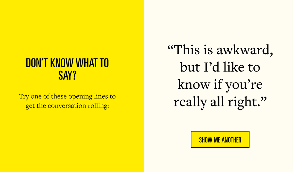 But there are some promising efforts. Campaigns run by organizations like To Write Love On Her Arms and the American Foundation for Suicide Prevention are some of the most notable. The AFSP's 2018 Suicide Prevention Campaign is called "Seize The Awkward," a campaign that sheds light on the fact that conversations about suicide can be awkward and uncomfortable and not fun to have. And once we acknowledge that, it makes it that much easier to actually have them.