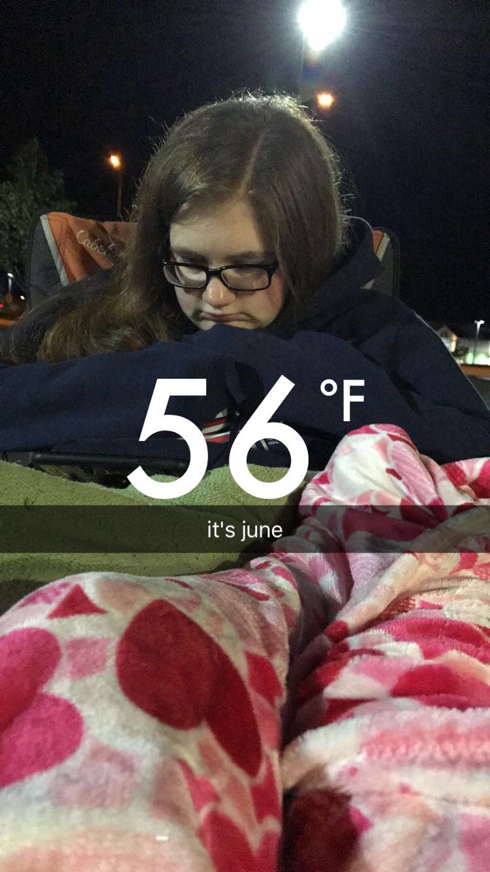 I keep wanting to ask Jenna for her car keys so I can sleep somewhere even slightly warmer and comfier, but she is busy with her TV show, and I am dying inside, so I wait. I wait.