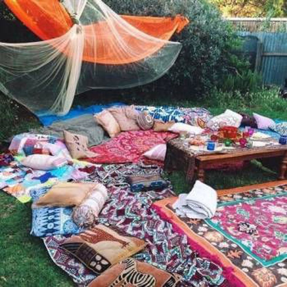I'm a gypsy woman, but I like to make my camp as "homey" as possible. I bring every tapestry I own, paper lanterns, dream catchers, LED battery string lights, incense, pillows and blankets to make my fortress as relaxing as possible. Plus, if your camp is super cute, more people will come and chill!