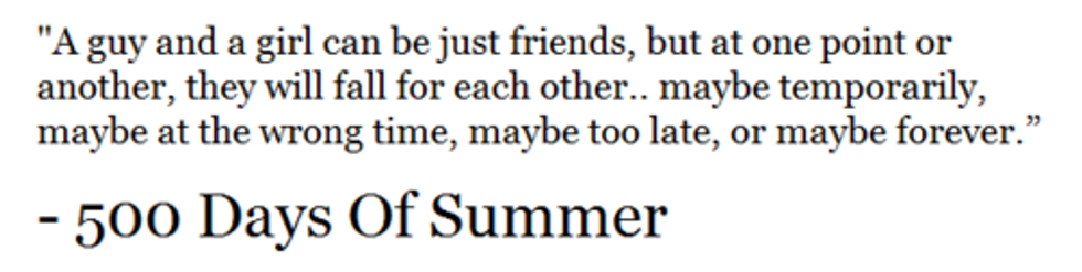 “I think guys and girls can be just friends in the sense that nothing romantic will ever actually happen between them, but I do think that one person will always have feelings for the other. I know in all three of my close guy/girl friendships, there's been one person, whether that be myself or the guy, who has had unreciprocated feelings for the other.” -female, sophomore