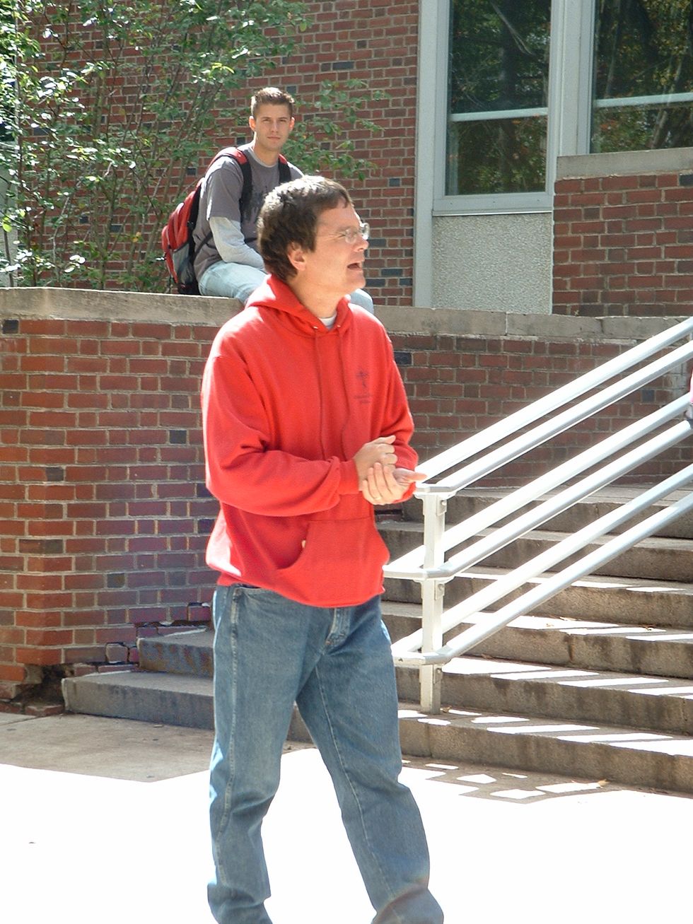 You’ve seen him. You can’t miss the bright red sweatshirt, hunched shoulders, and constant presence outside of Willard. Sometimes he’s pensive, sometimes he’s defensive, and most times he’s outright offensive. Yet each day as I pass him on my way into class, I wonder: is he a crotchety middle-aged man who takes pleasure in irritating people by the minute, or is he merely stirring the pot?