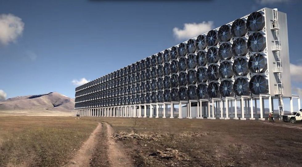 The wall will be made up of a stack of cube shaped fans. The fans suck in the air molecules, which are captured by carbon-absorbent surfaces. Those molecules are then turned into a liquid that will be harden and turned into solid carbonate pellets. Then the pellets are melted to release pure carbon dioxide, which can be used as fuel.